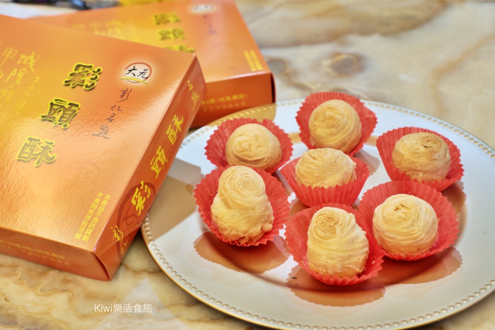 大元蔴薯(鹹麻糬)彩頭酥跟芋頭酥外型差不多,所以外皮很酥,宛若堆疊而成的薄餅乾,口感直逼千層酥。