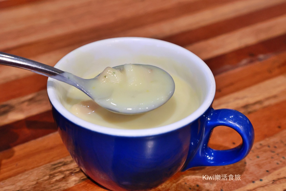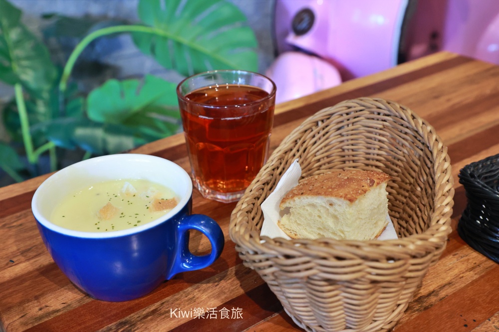點義大利麵或頓飯都會有佛卡夏麵包跟紅茶,加購主廚濃湯跟甜點。