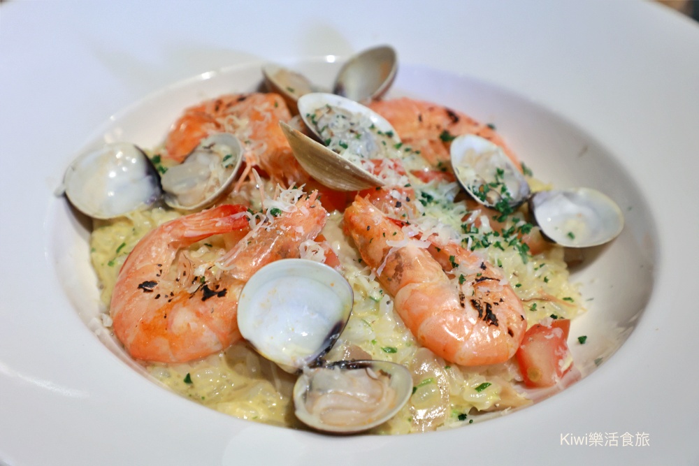 香蔥奶油鮮蝦蛤利燉飯,蝦子的鬚都剪掉了,蛤利也是很大顆。