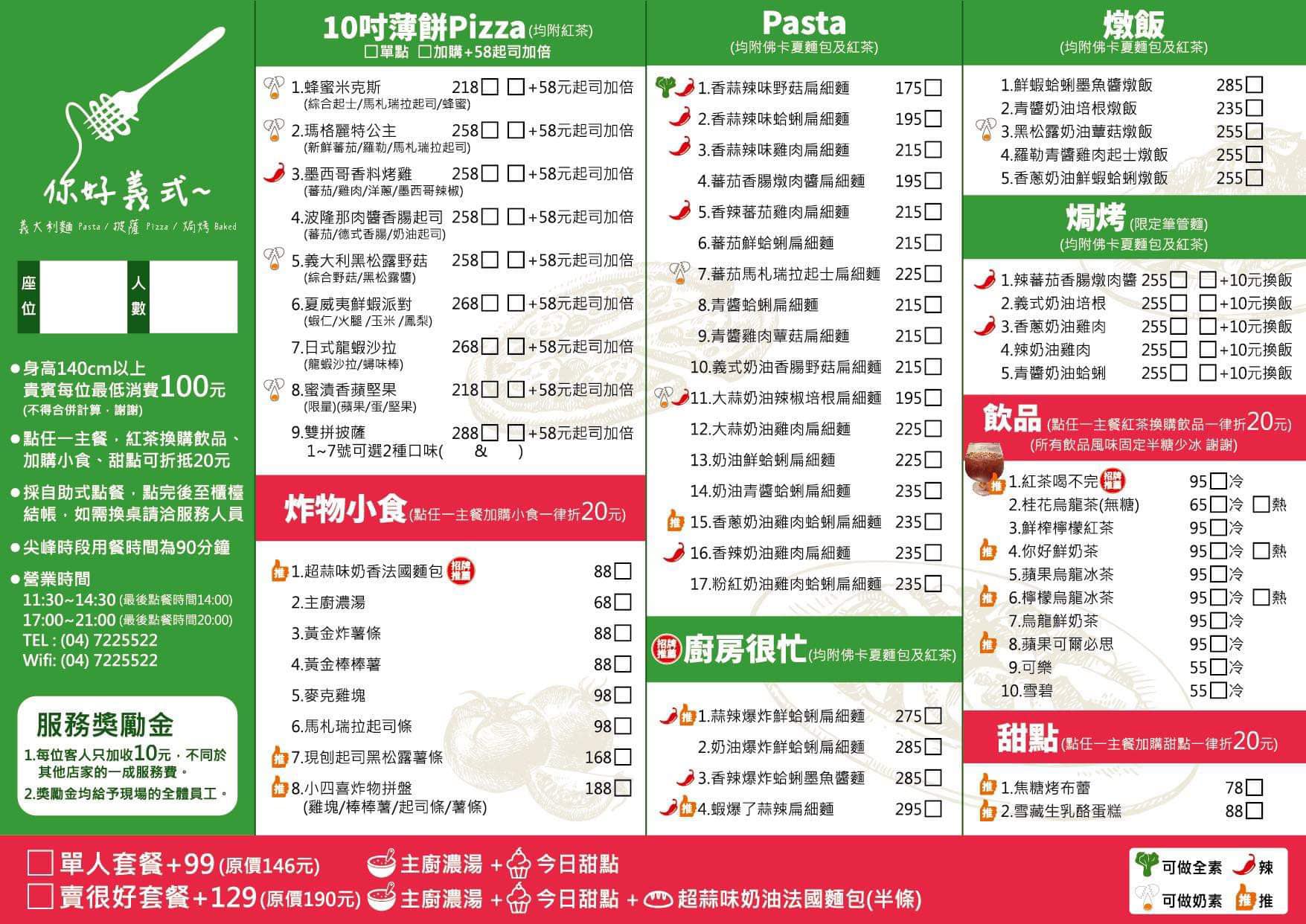 彰化市美食你好義式餐點有薄餅pizza、炸物小食、Pasta、燉飯、焗烤、飲品、甜點、細麵,其中每位客人也只收10元服務獎勵金,很酷吧!