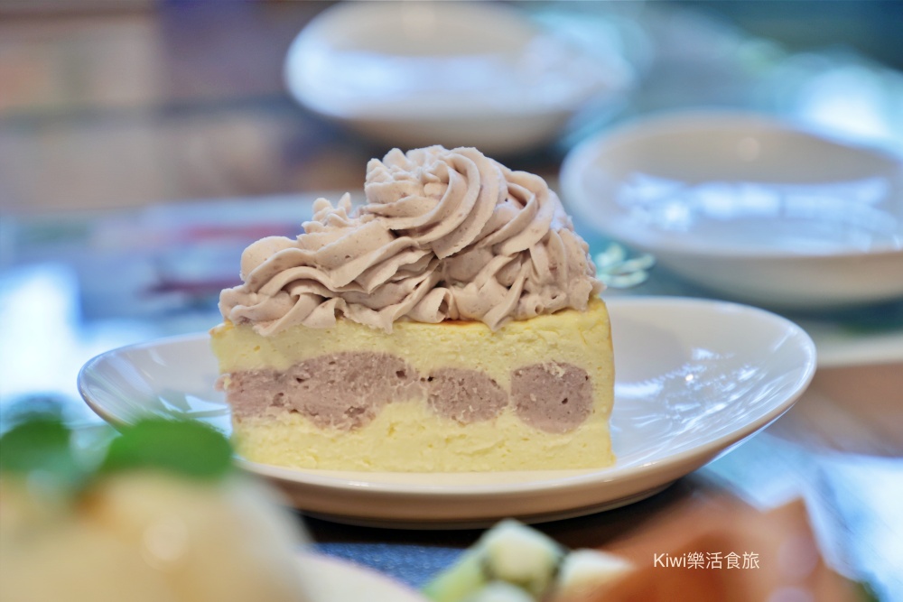 彰化二水美食推薦sweego水水果饌體驗館芋泥巴斯克蛋糕也好吃,吃得到很綿密的口感。