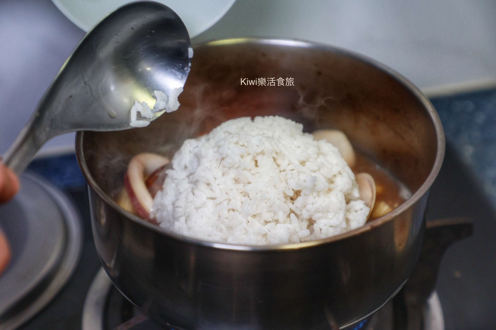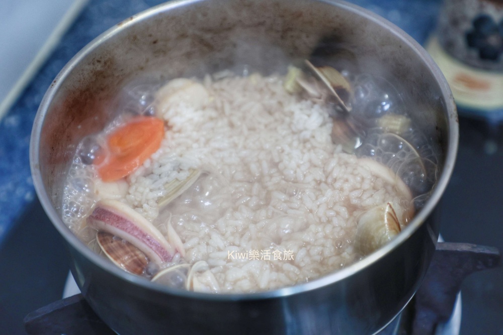 湯滾後接著放入海鮮,最後是一碗白飯,蓋上鍋蓋,約5分鐘再次打開,攪拌均勻,記得中火轉小火才能收汁變成燉飯呀!熱騰騰燉飯也跟著出爐了~開心!