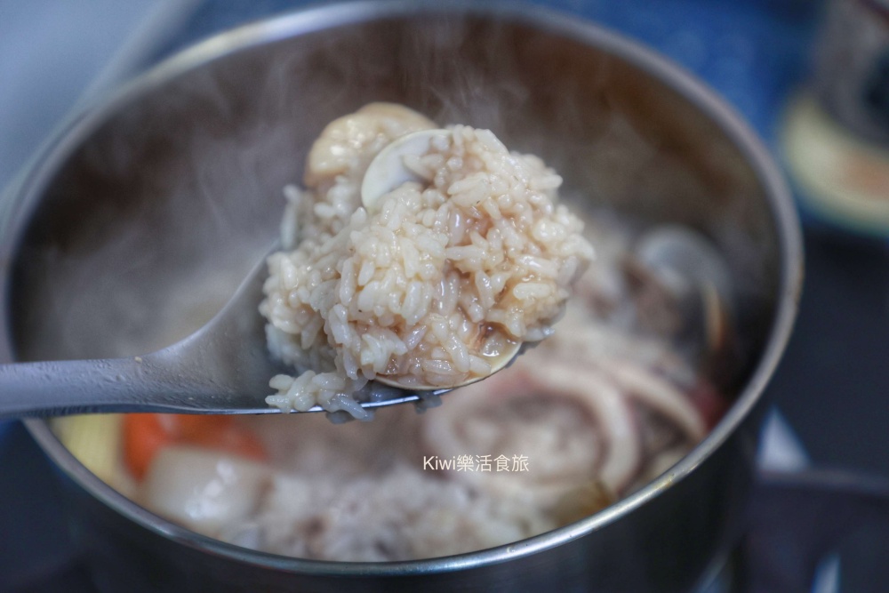 雞湯的味道不重但香氣十足,加入蛤蠣、小卷、干貝這樣的海鮮,讓湯頭也更不一樣,米飯的收汁恰到好處,一口接著一口,真的好美味喔!