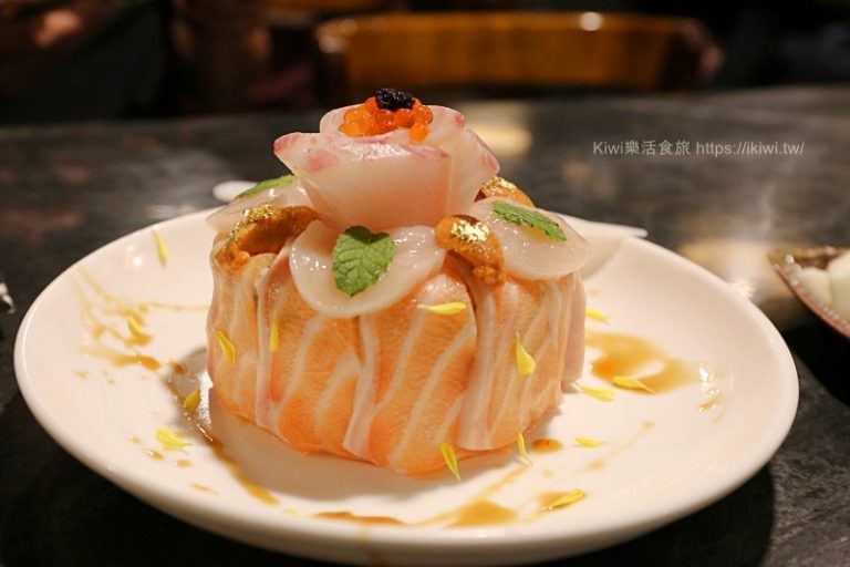 創意滿分的生魚片壽司蛋糕,堆疊的就好像握壽司的特大號版,最上方還鋪著干貝,金箔、海膽魚子醬點綴著整個壽司蛋糕,玫瑰花的裝飾讓人覺得美到都捨不得切下去呢!