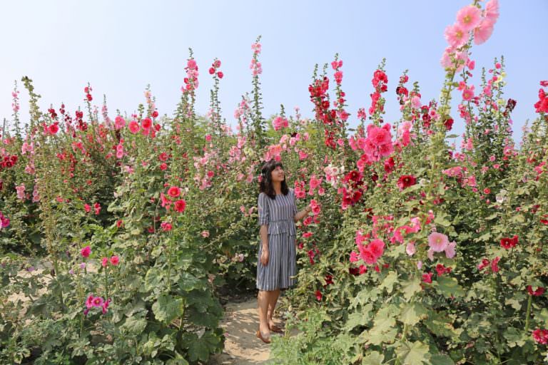 台南學甲景點推薦蜀葵花文化節中的一丈紅怎麼拍都好美,尤其是滿開的時候,藏在花裏還會找不到人呢!