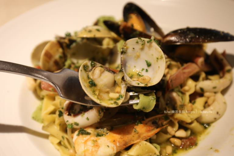 小義大利的海三鮮松子貝斯多綠絨手工彩虹寬麵,屬於味道重的義大利麵料理。