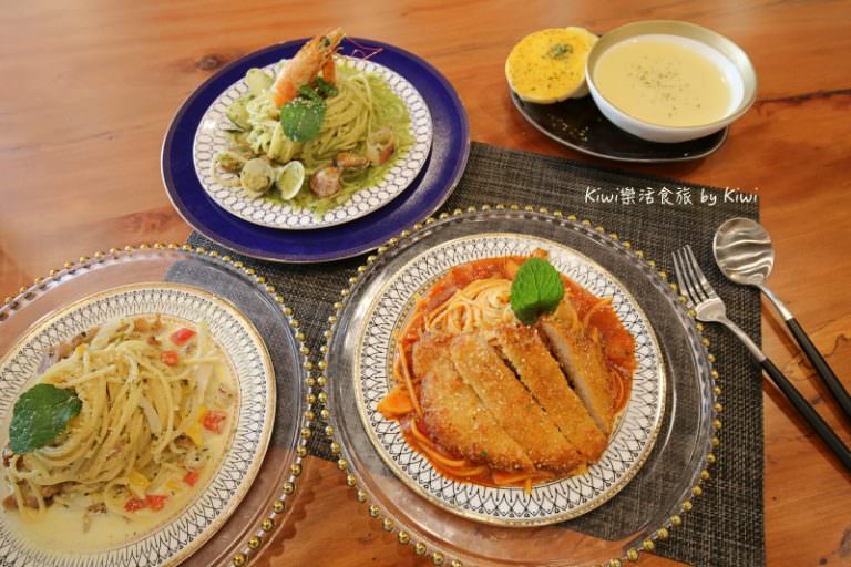 我們點了一份白醬雞柳義大利麵、青醬海鮮總匯義大利麵、紅醬經典豬排義大利麵