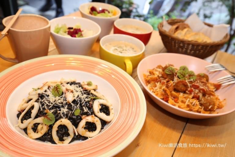 接著我們的墨魚燉飯、火山牛肉丸義大利麵的套餐陸續上桌,這一盤盤的繽紛色彩看得眼花撩亂,今日濃湯、生菜沙拉、麵包都來囉。
