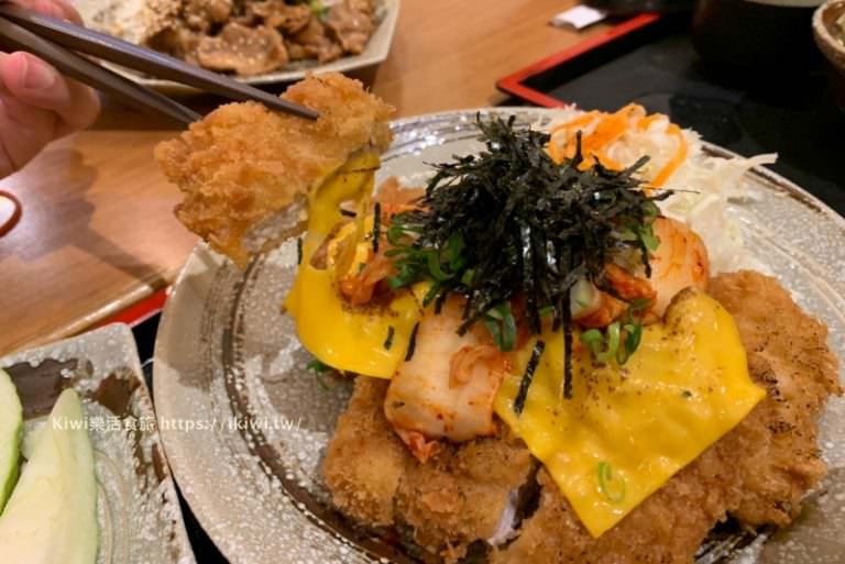 裹上麵衣的豬排上鋪著泡菜起司,味道更加的濃郁,